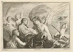 Teniers used full colour in the modelli, rather than grisaille. This could mean that he intended these reproductions to function as independent records of some of these Italian paintings in the Archduke's collection. From the many modelli, which have been preserved, it is obvious that Teniers's copies constitute a true record of the originals even while he left out details and painted them in his typical fluid and transparent manner. The engraving of the catalog by engravers who worked after the modelli, not the originals, was started by 1656.[5] In the 17th century there existed no efficient method for inverting images. As a result, most of the prints in the catalog are reverse images of the originals.[6] Each print gives the name of the author of the original work on the left hand side (indicated by the letter 'p' for 'pinxit', Latin for 'painted by') and the engraver of the print on the right hand side (indicated by the letter 's' for 'sculpsit', Latin for 'engraved by'). Some editions also indicated the original dimensions of the paintings.[7]