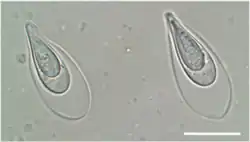 Thelohanellus kitauei is a myxozoan endoparasite identified as the agent of intestinal giant-cystic disease (IGCD) of common carp Cyprinus carpio. The species was first identified in Japan, in 1980[1] and later formally described by Egusa & Nakajima.[2] Fan[3] subsequently reported the parasite in China, and several other reports from carp and Koi carp in China and Korea followed.[4][5][6] Reports referred to an intestinal infection, swelling and emaciation of fish due to blockage of the intestinal tract by giant cysts. The intestine of carp was believed to be the only infection site of T. kitauei until Zhai et al.[7] reported large cysts of T. kitauei in the skin, with morphologically similar and molecularly identical spores. T. kitauei has been recognized as the most detrimental disease of farmed carp in Asia with around 20% of farmed carp killed annually.[8] In 2014, the genome of T. kitauei was sequenced,[8] and in 2016, its life cycle was found to include the oligochaete Branchiura sowerbyi.[9] Infected oligochaete worms were first discovered in Hungary and raised concerns of the introduction of T. kitauei into European carp culture ponds, since it was believed to be endemic to Asia. However, the related disease (IGCD) has not yet been reported in Europe.