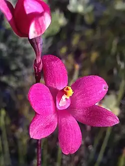 Thelymitra × macmillanii, commonly called the red sun orchid[2] or crimson sun orchid[3] is a species of orchid that is endemic to south-eastern Australia. It has a single tapering, channelled leaf and up to five bright red, sometimes yellow flowers. It is a natural hybrid between T. antennifera and T. carnea or T. rubra.