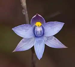 Thelymitra malvina, commonly called the mauve-tufted sun orchid,[2] is a species of orchid, native to eastern Australia and New Zealand. It has a single large, fleshy leaf and up to twenty-five blue to mauve flowers with pink or mauve tufts on top of the anther.