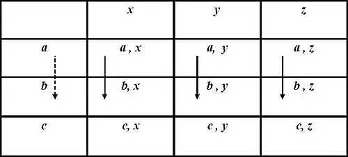 Consider two natural attributes A, and X. It is not known that either A or X is a continuous quantity, or that both of them are. Let a, b, and c represent three independent, identifiable levels of A; and let x, y and z represent three independent, identifiable levels of X. A third attribute, P, consists of the nine ordered pairs of levels of A and X. That is, (a, x), (b, y),..., (c, z) (see Figure 1). The quantification of A, X and P depends upon the behaviour of the relation holding upon the levels of P. These relations are presented as axioms in the theory of conjoint measurement.