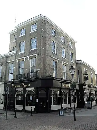 The Thieves' Kitchen (formerly Vintner's Parrot and before that Thieves Kitchen) is a pub in the centre of the town and borough of Worthing, West Sussex. Established as a public house in the late 20th century, it occupies two early 19th-century listed buildings in the oldest part of the town: a Greek Revival-style former wine merchants premises,[1] and a Neoclassical chapel built for Wesleyan Methodists in 1839.[2] The main part of the pub is in the wine merchants building facing Warwick Street, while the old chapel (usually called Bedford Hall), facing Bedford Row, serves as its function room. Both buildings have been designated separately as Grade II Listed Buildings.[3][4]