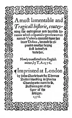 - A most lamentable and tragicall historie, conteyning the outragious and horrible tyrannie which a Spanishe gentlewoman named Violenta executed vpon her louer Didaco, because he espoused another beyng first betrothed vnto her. Newly translated into English meter, by T.A. (1576) London: Thomas Butter. STC 1356.4. Printed by John Charlewood for Thomas Butter, and dedicated to Sir Thomas Gresham. Not a translation, but a poem based on William Painter's prose story in his Palace of Pleasure (1566).[8]