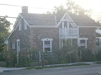 The 1+1⁄2-story house, with a rock basement (a former wine cellar), is made of 1.5-foot (46 cm) uncoursed rubble with cut-stone quoins on each corner. Each floor has four rooms; the hall-and-parlor plan on the front is hidden by a symmetrical, minimally-decorated facade, with an attic door set in a gable to allow large items to be brought up. Two large stone fireplaces remain in the front rooms. The building is extended by an original one-story lean-to on the rear, which served as the kitchen and hosts the staircase to the upper floor.[2][3]