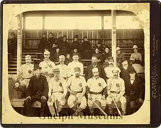 This interest by both men in associating sport with civic promotion was typical, according to sports historian William Humber, of an era “when leagues meant little, and the size of a town meant less than the promotional elan of some local patron who wanted to put his town on the map”.[1] During the early days of baseball in Guelph, the sport reflected the varied social composition of the city. It was an ideal social equalizer, as it allowed young men from prominent and privileged families, such as Goldie's sons, to play with those from families of less means. The Guelph champions of 1869 included “locally born machinists, as well as a butcher, a tinsmith, a miller, and a Methodist clergyman.”[1] By the mid-1880s, however, the team was facing financial trouble in the semi-professional circuit. Its glory days became overshadowed by the retirement of players and narrowing profit-margins which forced Sleeman to disband the team in 1886.[2]