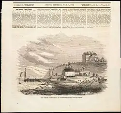 In 1833, the Boston Asylum for Indigent Boys was moved to the island, and in 1835 it merged with the Boston Farm School Society to become the Boston Asylum and Farm School for Indigent Boys. Many of the students who went to school on the island lost one or both parents, or had parents who were unable to care for them.[5] In order for a student to be enrolled in the school, the parents or guardians had to sign a form giving the school guardianship of the boys until they were 21 years old.[6] While on the island, parents were only able to see their child once a month during visit days and for two weeks during the summer when the boys were allowed to return home.[7] Many "distraught mothers" [7] changed their minds about having their boys at the school and wanted to have them withdrawn. There are several documented cases where the school returned guardianship to the parents, who were then able to have their child come back home.[8]