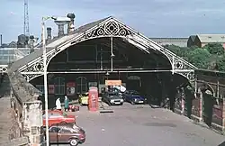 After being taken over by British Railways on nationalisation, the decayed station was never really repaired post war, but kept its proud staff and hence well kept flower borders.[3] The variety of stone carvings also gained the station an entry in the newly created Guinness Book of Rail Facts and Feats.[3] With dwindling passenger numbers, staff were removed in the early 1970s, which led to a dramatic level of vandalism to the decayed station structures. After promises to refurbish the station due to local protests from 1977, the station buildings were demolished in December 1981 in what was described locally as "institutionalised vandalism".[3] In both 1988 and 1994, BR proposed renaming the resulting "bus shelter" station as Stockton, but this and a later proposal in 2000 by Northern Spirit to rename the station as South Stockton were stopped by local protests.[3]
