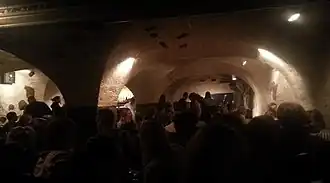 The basement consists of a number of vaulted rooms with arched columns made of brick. It was constructed by Cistercian monks in the 1300s but not much else is known about it or the structure originally above it. The front entrance displays a sign stating that it was built by the monks and that they used it as a dining hall. There is, however, no evidence to support the latter claim.[2][3] Another myth states that a secret tunnel leads from the basement to the nearby Cathedral but this is also not true.[4][5]