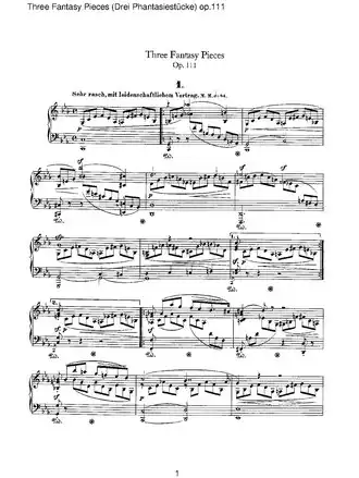 The two pianists James Friskin and Irwin Freundlich present the Three Fantasiestücke for piano, Op. 111 as follows:[7] "These short pieces were intended to be played in sequence; but this does not seem absolutely essential."[7]