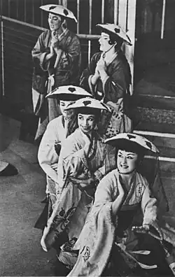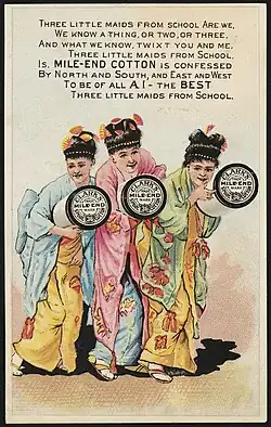 In an 1885 interview with the New-York Daily Tribune, W. S. Gilbert said that the short stature of Leonora Braham, Jessie Bond and Sybil Grey "suggested the advisability of grouping them as three Japanese school-girls", the opera's "three little maids". He also recounted that a young Japanese lady, a tea server at the Japanese village, came to rehearsals to coach the three little maids in Japanese dance.[1] On 12 February 1885, one month before The Mikado opened, The Illustrated London News wrote about the opening of the Japanese village noting, among other things, that "the graceful, fantastic dancing featured ... three little maids!"[2]