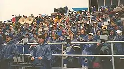 In 1981, a small group of students created a pep band for the then Division III football team.[11][12] Throughout the 1980s and 1990s, the band grew to become a Student Association group, so beginning the University at Buffalo Blue Noise Pep Band.[11][12] During this time, there was talk of restarting the marching band, however it never developed.[11][12] In 1999, football returned to Division I. With this, the university decided a marching band was again a necessity. Mark Flynn was made the director,[11][12] and with the efforts of Kappa Kappa Psi, many local high schools, and Student Affairs, the Thunder of the East made its debut on September 11, 1999.[11][12][13] In 2000, the band began its second season with new uniforms and new words to Victory March written by Mols, the original composer.[11][12] It's believed that there were never any words for the original song. In the fall of 2001, the band made its first road trip in nearly 30 years to West Point to cheer on the Buffalo Bulls at Army's Michie Stadium.