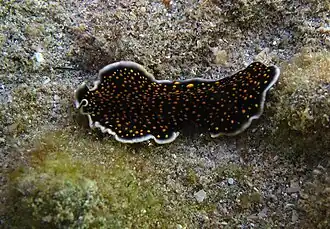 Thysanozoon nigropapillosum has a long body and broad shape. They grow up to 3 in (76 mm).[2] The dorsal surface is deep black and covered with numerous yellow-tipped papillae varying in size. The ventral surface is dark brown. The outer margin of the body is slightly wavy and bordered in opaque white. They have small, ear-like pseudotentacles in the middle of the anterior end.[3] They swim by propelling themselves through the water with a rhythmic undulating motion of the body.[2]