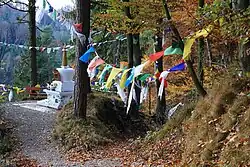 The Tibet-Institut Rikon is the only monastery outside Asia that was founded on behalf of the Dalai Lama. It was inaugurated on 9 November 1968 under the name „Kloster zum Rad der Lehre„ (literally: Monastery for the Wheel of Teaching) - but as a “Monastic Tibet Institute,” as the founding of a monastery was not permitted under the then Swiss federal constitution.[3] The Dalai Lama was also not present at the inauguration: the Federal Council banned him from entering the country.[3] He visited the monastery for the first time in 1973.[4][3] The monastic community in Rikon claims to be the only Tibetan monastery in the West.[5] The monastic Tibet Institute in Rikon was established according to the advice and under the patronage of the 14th Dalai Lama, who emphasized the importance of monasteries for Tibetan people in exile. The Dalai Lama sent an abbot and four monks to Rikon from India. The institute's buildings were designed by architect Ueli Flück (Baden AG), and the foundation stone was laid on 29 July 1967. On 9 November 1968 the monastic Tibet Institute was consecrated by the Dalai Lama's two principal teachers, Trijang Rinpoche and Ling Rinpoche,[6] under the name "Kloster zum Rad der Lehre" (literally: Monastery for the Wheel of Teaching).[4] On 8 April 2010 the 14th Dalai Lama visited the monastery community in Rikon for the 14th time, and was warmly received by Tibetan people, on the occasion of the 50th anniversary of the establishment of Tibetan refugees in Switzerland.[7] The 14th Dalai Lama visited the monastic community again in 2013, 2015 and 2016.[6]