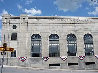 Ticonderoga National Bank is a historic bank building located at Ticonderoga in Essex County, New York. It was built between 1927 and 1929 and is a two-story, three by seven bay, trapezoidal granite building in the Renaissance Revival style. It features a monumental arcade, large round arched windows, and a massive banking hall.[2]