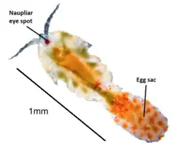 T. brevicornis undergoes several stages of development, with 12 distinctive post-embryonic developmental stages; 6 naupliar (copepod baby) stages, 5 copepodid (teenage) stages and an adult stage.[8] Animals are sexually dimorphic and males are usually slightly smaller than females, possessing enlarged antennules. These antennules are used to perform a characteristic mate-guarding behaviour to secure a potential mate, where they grasp females before the actual mating event. Mating pairs will stay attached for several hours, and sperm is stored in a special organ known as a spermatheca. Females are highly fecund and usually bear multiple broods of eggs developed sequentially after a single mating with brood sizes of 30–50 nauplii. Fertilised T. brevicornis females are easily identifiable by the presence of a large dark egg sac attached to their hind segment. Other Tigriopus spp. females have varying numbers of egg sacs attached posteriorly (see image below).[12]