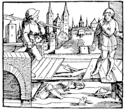 Woodcut for the 32nd chapter in the 1515 edition: Eulenspiegel is pursued by Nuremberg guards, he leads them across a broken bridge and they fall into the moat.
