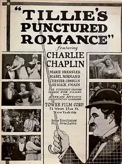 Tillie's Punctured Romance is a 1914 American silent comedy film directed by Mack Sennett and starring Marie Dressler, Mabel Normand, Charlie Chaplin, and the Keystone Cops. The picture is the first feature-length comedy[2] and was the only feature-length comedy made by the Keystone Film Company.