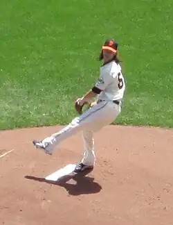 When pitching, Lincecum would start with his back slightly to the plate, his left leg raised, and his glove held over his head. Then, he would take a step of about seven feet forward, maneuvering his hips over the place his left foot was now planted as he released the ball. This helped him to generate high velocity despite his slight build. The power behind the throws was generated not just from the arm, but also from the long stride and the hip muscles.[6] Sportswriters Bob Nightengale and Robert Falkoff both thought that Lincecum was a similar pitcher to Roy Oswalt.[142][143]