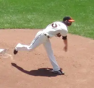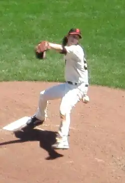 In July, Lincecum went 4–0 with a 1.62 ERA.[26] On July 1, in a seven-inning performance against the Arizona Diamondbacks, he recorded 12 strikeouts and allowed just three hits in a 13–0 victory.[27] Lincecum pitched into the ninth inning for the first time on August 21 against the Cubs, holding a 1–0 lead. He had allowed just two hits and one walk through the first eight, while throwing only 88 pitches. Cubs shortstop and future 2012 World Series champion teammate Ryan Theriot said after the game, "He's got electric stuff. The best stuff I've seen all year."[28]