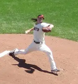 From April 2 through April 24, Lincecum won his first four decisions of the 2008 season.[32] On May 15, Lincecum struck out 10 Astros in six innings.[33] Houston first baseman Lance Berkman offered his view of Lincecum: "He has three almost unhittable pitches...When he throws those off-speed pitches where he wants, you've got no chance."[34] After his team fell to Lincecum and the Giants 6–3 on May 27, Diamondbacks first baseman Conor Jackson gave his impression of facing Lincecum: "From what I saw tonight, that's the best arm I've seen all year, no doubt. You've got to almost hit a ball right down the middle. You're going to pop up the ball at your bellybutton, which we all did tonight, and the one down, it's coming in at 98 mph (158 km/h), you're not going to put too much good wood on it. Even the ones down the middle are coming at 98. He's good, man."[35]