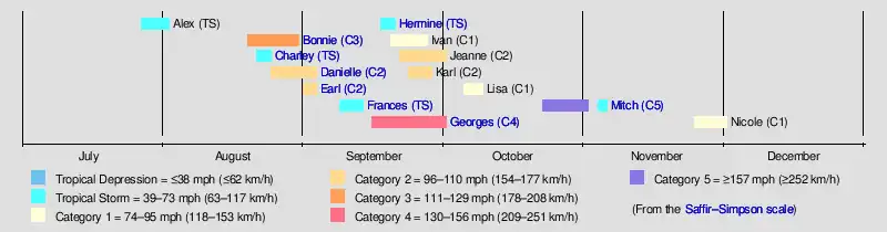 Hurricane MitchTropical Storm Hermine (1998)Hurricane GeorgesTropical Storm Frances (1998)Hurricane Earl (1998)Hurricane Danielle (1998)Tropical Storm Charley (1998)Hurricane Bonnie (1998)Saffir–Simpson scale