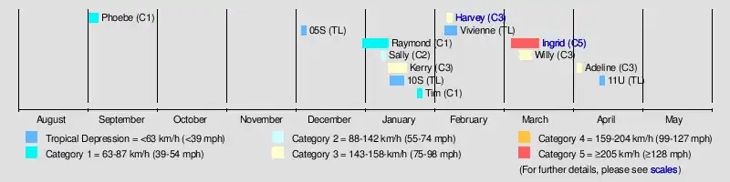 During the season at least five people were killed from tropical disturbances while overall damage was estimated at $15.4 million (2005 USD; $24.8 million 2025 USD). Severe Tropical Cyclone Harvey caused an estimated $1 million (2005 USD; $1.61 million 2025 USD) in damage in Northern Territory when it made landfall in February.[2] The most damaging storm of the season, Severe Tropical Cyclone Ingrid, killed five people and caused an estimated $14.4 million (2005 USD; $23.2 million 2025 USD) as the first tropical cyclone on record, to bring hurricane-force windspeeds to Queensland, Northern Territory, and Western Australia.[3]