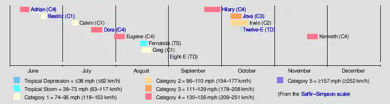 Tropical Depression Twelve-E (2011)Hurricane Jova (2011)Hurricane Hilary (2011)Hurricane Dora (2011)Hurricane Beatriz (2011)Hurricane Adrian (2011)Saffir–Simpson scale