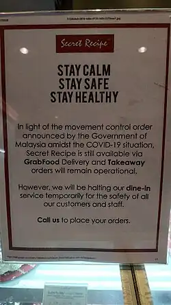 On 16 March, Prime Minister Muhyiddin Yassin announced that the federal government would be imposing a nationwide lockdown known as the Movement Control Order (MCO), which would come into effect on 18 March and last for two weeks.[100][75]