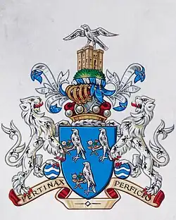 Azure three Hawks close Ermine each grasping in the dexter claw a Rose Argent barbed seeded slipped and leaved Or and a Thistle proper slipped and leaved Or And for the Crest Upon a Helm with a Wreath Argent and Azure Upon a Mount Vert a triple-towered Castle proper thereon a Hawk wings expanded Ermine Manteled Azure doubled Argent.