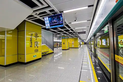 Tinggang Station (simplified Chinese: 亭岗站; traditional Chinese: 亭崗站) is a station of Guangzhou Metro Line 8, located underground on the south side of Hubin South Road, Shisha Road, Baiyun District, Guangzhou, Guangdong Province, China. The station was opened on November 26, 2020 with the opening of the northern extension of Guangzhou Metro Line 8.[1]