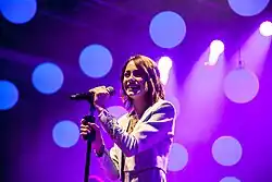 In May 2019, it was announced that Stoessel had joined the reality talent show Pequeños Gigantes Argentina as a judge.[73] The collaboration between Stoessel and Greeicy titled "22" was released on 3 May 2019 as the first single from Stoessel's third album.[74] The song peaked at number eight on Argentina Hot 100 and became Stoessel's first top-ten single on the chart.[75][76] On 14 June 2019, Stoessel was featured on "Sad Song", a collaboration with Swedish DJ Alesso.[77] On 26 July 2019, Stoessel released "Suéltate el Pelo" as the second single from her third album, as well as part of promotion for Pantene.[78] On 6 September 2019, Stoessel released "Fresa", a collaboration with Colombian singer Lalo Ebratt, as the third single from her third album.[79] The song peaked at number three on Argentina Hot 100, becoming Stoessel's first top-five single on the chart.[80][81][82] On 11 October 2019, Stoessel released "Oye", a duet with Sebastián Yatra, as the fourth single from her third album.[83] The song debuted at number three on Argentina Hot 100, becoming Stoessel's second top-five single on the chart in a row.[81] The single became the third song in the history of the chart to achieve a debut at No. 3, and made Stoessel the only female to debut two songs in the top-5 on the AR Hot chart. On 10 January 2020, Stoessel released "Recuerdo", a collaboration with Venezuelan duo Mau y Ricky, as the fifth single from her third album.[84]