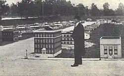 The miniature city project involved students from Springfield's eighteen public schools.[5] The students, who were learning construction and handicraft, built the city of about 1,200 structures under the supervision of their teachers. It consisted of 1,000 miniature houses, in several neighborhoods, and 200 other structures. The miniature buildings and houses were built according to standard construction plans, and lumber and building-materials companies donated items for the project.[21] The buildings and homes were landscaped with real grass.[22] Their interiors were furnished and decorated like a full-sized house or building.[23] The buildings were scaled at one-half inch to the foot.[24] Tiny Town, with water mains and electric lights, was laid out on streets like a real city.[1]