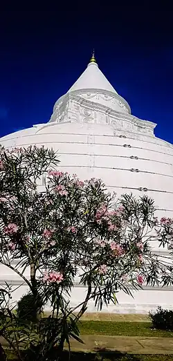 Tissamaharama Stupa is the largest stupa in the Southern region of the country with a height of 156 feet and 550 feet in circumference.[10] According to chronicles, King Kawan Tissa had sought blessings and instructions from Arhant Gothama Thera, who was a spiritual adviser to the king, when constructing Tissamaharam stupa.[10] The stupa was built to commemorate Buddha's visit to the area, at the same place where Buddha spent time in meditation with 500 arhant Buddhist monks. The stupa which has a 'Bubble Shape' and was built by using bricks on a square platform made of granite stones. King Kawan-tissa received the instructions of Buddhist monks throughout the construction period of the stupa. The relics enshrined in this stupa is subjected to debate. According to Mahavamsa the frontal bone relic (Lalata Dhathu) is enshrined in Tissamaharam stupa as the main relic.[11] However some believe that the frontal bone relic of Buddha was temporally enshrined in this stupa but later it was enshrined in the Seruvila Mangala Maha Seya(Thissa Maha Viharaya).[10] A recent discovery of a pillar inscription in Kirinda, reveals that the left tooth relic of Buddha was also enshrined in this stupa.