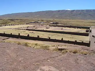 ![]() The Tiwanaku River flows between the archaeological site of Tiwanaku and the village of the same name north west of it (on the left) and the Taraco range (in the background). | |