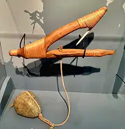 Wooden halibut hook and stone sinker at the Totem Heritage Center in Ketchikan, Alaska
