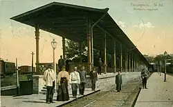 In the background, soldiers climb the steps to the carriages. They are being watched by gendarmes who appear to be coldly indifferent to the people's grief. An officer stands on the platform, with two soldiers standing at attention in front of him.[21] Unlike the first version of the painting, in which the station's platform was parallel to the plane of the canvas, the final version shows it in perspective distance.[24] According to some sources, the painting depicts the landing stage of the Taganrog railway station,[5] according to others it is one of the St Petersburg railway stations.[27]