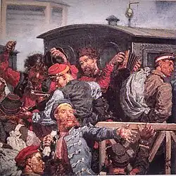 In the background to the left of the painting, partially obscured by the figures in the foreground, is a group of drunken soldiers dancing to a harmonica and violin.[35][39] According to Dmitry Sarabianov, "now these people do not care where they will be taken, what they will be forced to do, with whom they will have to fight; for a while they have drowned their greif in wine, but the more bitter the hangover will be".[39] Other writers, on the other hand, saw in this scene "the breadth of Russian nature and the ineradicable folk optimism".[43] The artist's wife, Valeria Ippolitovna, recalled that Savitsky "fiddled a lot with perspective, especially confused by the figure of the dancing soldier, where the leg is at a great angle".[21]