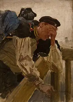 Another important figure is the peasant standing by the cart on the right-hand side of the canvas. Savitsky picks him out of the crowd of people bidding him farewell. His face, pose and movements convey strength and confidence.[39] The peasant's clothes - a patched shirt, trousers, puttee and bast shoes - testify to his poverty. His figure is in the background, so that he can observe the farewell scene of the conscripts and their relatives in the foreground.[40] The fact that he does not say goodbye to anyone suggests that his relatives are not among the soldiers going off to war - apparently he has just taken someone he knows with him on a cart.[39] Obviously, he has seen a lot in his life, so he understands the essence of what is happening better than others - hence, according to Elena Levenfish's description, the "hatred in his sullen gaze, a maturing protest." Savitsky's contemporaries emphasised this character, calling him a "ploughman-athlete", a "mighty worker" and a "black soil strength".[40] His image was later compared to two figures in Kramsky's paintings of the Peasant Cycle - Forester[33] and Meditator.[40] According to the art historian Mikhail Sokolnikov, the figure of the peasant forms a kind of centre in the right-hand part of the composition, and his "gigantic image breathes such power and strength, is so plastically expressive that the viewer feels in him a symbol of the people awakening to consciousness and the unbending will of the people".[41] A similar image of the peasant was also present in the 1880 version, albeit with the addition of a weeping peasant woman next to him, covering her face with her hands and leaning against the edge of the cart[40] (fragment Crying Peasant Woman and Peasant Man at the Cart, private collection).[11] In contrast to the final version, in the initial version the group with the cart was situated in the foreground on the left side of the painting.[40]