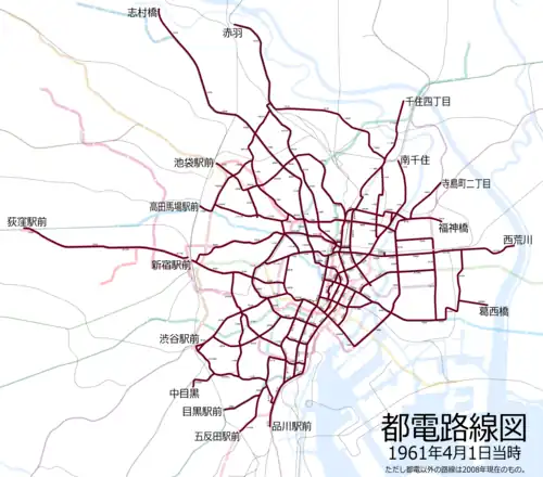 The Tokyo Toden (東京都電, Tōkyō Toden) or simply Toden, is the tram network of Tokyo, Japan. Of all its former routes, only one, the Tokyo Sakura Tram, remains in service.[1] The Tokyo Metropolitan Bureau of Transportation operates the Toden. The formal legal name is Tokyo-to Densha. Its nickname, "Toden," distinguished it from the "Kokuden" (the Japanese National Railways electrified lines).