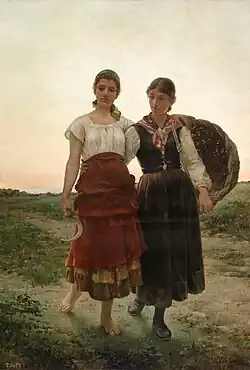 In 1886, he was awarded a stipend from the provincial government in Oviedo, to help finance further studies in Rome. Later, thanks to critical praise for several of his works, the stipend was extended, allowing him to tour Italy and France, and spend his summers at home with his group. With "At the Fall of Evening", painted in Rome in 1889, he was awarded a third-class medal at the Exposición Nacional de Bellas Artes in 1890. It was acquired by the Ministry of the Interior, and may now be seen at the Museo del Prado.