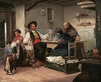 Ill and out of money, he returned home in 1892 and settled in his native village, although he continued to travel; visiting Madrid, Barcelona and Paris for extended periods. In 1897, his entry at the Exposición Nacional, The Banks of the Nalón, earned him a Knighthood in the Order of Charles III. He also created a portrait of King Alfonso XIII, as a child, for the Casino Español in Guantánamo, Cuba. In 1899, he painted The Asturian Reaper, which was awarded a silver medal at the Exposición Regional of Gijón in 1905. That same year, he was named a corresponding member of the Academia de San Fernando.