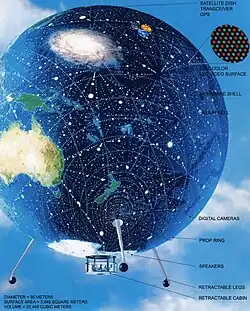 The Video Airship is an ongoing project which weaves together several themes in Shannon's work. In the late 60's Shannon proposed spherical televisions linked to orbiting camera satellites. Buckminster Fuller had earlier proposed a 200-ft sphere covered with lights to display Earth to the United Nations. Shannon designed a LED-covered spherical blimp with cameras that could land at school campuses and other public locations to deliver education and at night host rave dances.[23] Aerovironment, Inc., the engineering firm founded by aeronautics legend Paul MacCready, found the design feasible; it can be aerodynamically controlled and can present clear computer video in daylight.