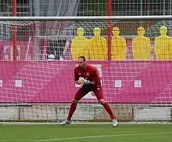 Shortly after, Starke was signed by Bayern as goalkeeping coach coordinator.[149] Due to the injury of Manuel Neuer, Starke was called back to play for Bayern Munich in the pre-season matches of the 2017–18 season.[150][151][152] He was called to be in Bayern's UEFA Champions League squad in September 2017.[153] Starke made his return with some fine saves in a 1–0 victory over Eintracht Frankfurt on 10 December 2017.[154] In a follow–up match against 1. FC Köln, he made his second appearance for the side, keeping another clean sheet, in a 1–0 win.[155] Starke spent the rest of the 2017–18 season as a second choice goalkeeper behind Ulreich, as the club won the league once again.[156][157][158]