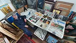 Tomas Kurth in April 2021, surrounded by some of his paintings.