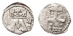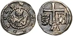 Initially, Tomasina had no official political role in Andrew's court and she was frequently styled as simply "the king's mother" (Latin: mater domini regis) in 1293. Nevertheless, she took part in decision making from the very beginning as one of the royal advisors of her son.[12] Her position and legal claim was strengthened by the fact that silver denarii were minted with her initial letter "M" and a crown shortly after her arrival to Hungary. Among these coins, three varians are known, two of them depicts the king and his mother (with crown) facing each other, between them a cross with the crown and letter "M" at the bottom. Although she was never crowned formally a "queen mother",[13][14] a separate queenly court had established around her person. For instance, she had her own count of the court (Atyusz Hahót), treasurer (Dominic Csák then Ladislaus Péc), chief steward (Lawrence Kórógyi) and cup-bearer (John Péc).[10][15] Andrew III donated the queenly estate of Segesd in Somogy County and other possessions to Tomasina to cover the costs of her household, thus she benefited from the traditional queenly possessions.[16] Only a non-authentic charter refers to her as "Duchess of Whole Slavonia and Lady of the Maritime Province" (Latin: ducissa totius Sclavonie et maritimarum partium principissa) with the date 1293.[12] In this document, Andrew III made a gesture by naming Paul Šubić the hereditary ban of Croatia and Dalmatia on condition of faithful service to the king and his mother. Its authenticity is accepted by some Croatian historians.[10] She styled himself simply "the king's mother" still in early 1295, when donated the estate Szob – a portion of the Segesd lordship prior to that – to ispán Ladislaus Tengerdi.[17]