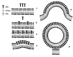 The membrane disruptive properties of tomatine are caused by the ability to form 1:1 complexes with cholesterol. A possible mechanism of the membrane disruption by glycoalkaloids is displayed in figure 2. First, the aglycon part of tomatine binds reversibly to sterols in the membrane (figure 2, part 2). When this reaches a certain density, the glycosidic residues of the glycoalkaloids interact with each other by electrostatic interactions. This interaction catalyzes the development of an irreversible matrix of glycoalkaloid-sterol complexes (figure 2, part 4). In this way, the sterols from the external membrane are immobilized and membrane budding will arise. Tubular structures are formed, because of the structure of tomatine (figure 2, part 6).[14][17] This membrane disruption causes cell death by cell leakage.[14] Also, the disrupted membrane has an influence on sodium transport, by altering the membrane potential and reducing active sodium transport. When tomatine is orally ingested, the brush border of the intestine is damaged by the membrane-disruptive properties of tomatine, so increased uptake of macromolecules occurs. This damage to the epithelial barriers is dose-dependent.[14][17]
