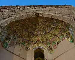 The northern edge of the complex's boundary walls features another large gateway. The gate is named the jawab, or "response", gate as a reference to the southern gate.[2] It is also a two-story structure, with a central arched iwan portal flanked by four smaller portals. The façade of the gate was covered in intricate tile work, known as kashi kari, some of which still survives.