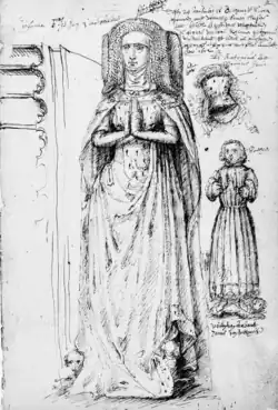 The tomb is today known from a number of drawings and written descriptions, the most detailed being from Charles de Rietwyck's 1600 'Sigillographica Belgica and Antoine de Succa's nl 1602 "Memoriaux". Succa also made notes, describing elements such as her blond hair and the coat of arms on her cloak.[6] De Rietwyck's notes detail that at the time, the tomb was positioned in the middle of the church's choir, that its epitaph was engraved on copper, and that it was 4 feet high, 10 feet long and 8 feet wide.[7]