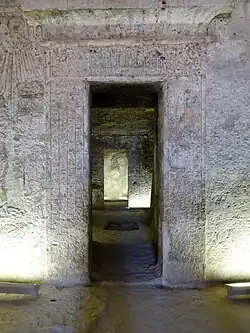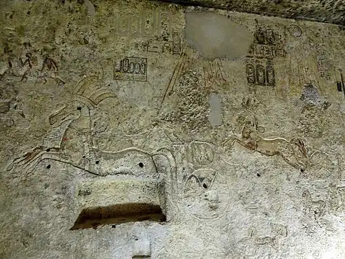 The tomb of Panehsy is part of the Northern tombs. These tombs are general larger than the tombs referred to as the Southern tombs. Panehsy's tomb, like the one belonging to Meryre, is known for the depictions of the temple of the Aten.[2] The Tomb of Panehsy[3] contains scenes of himself and his family[4] and others showing the royal family,[5] but his remains have never been identified. The tomb had suffered damage from iconoclasts. The images of Akhenaten and Nefertiti had been disfigured, and most of the names had been removed.[6]
