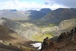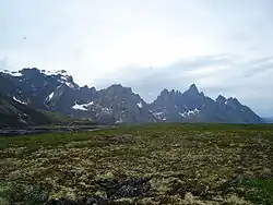 Tombstone Territorial Park is a territorial park in the Yukon, one of three territories in Canada. It is in central Yukon, near the southern end of the Dempster Highway, stretching from the 50.5 to the 115.0 kilometre marker. The park protects over 2100 square kilometres of rugged peaks, permafrost landforms and wildlife, including sections of the Blackstone Uplands and the Ogilvie Mountains.[1] The Park is named for Tombstone Mountain's resemblance to a grave marker.